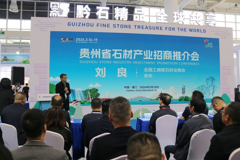 當(dāng)天上午,由省工業(yè)和信息化廳主辦,省石材協(xié)會協(xié)辦,由貴州科博展覽廣告有限公司執(zhí)行承辦的貴州省石材產(chǎn)業(yè)招商推介會在現(xiàn)場成功舉辦,中國石材協(xié)會、全國工商聯(lián)石材業(yè)商會、貴州省石材協(xié)會、省工業(yè)和信息化廳等相關(guān)負(fù)責(zé)同志出席并致辭。全國各地石材協(xié)會、采購商代表、建筑裝飾行業(yè)企業(yè)、以及貴州優(yōu)勢石材企業(yè)代表300余人歡聚一堂,共商黔石產(chǎn)業(yè)發(fā)展大計,中國石材網(wǎng)現(xiàn)場報道并直播了招商推介會盛況。
